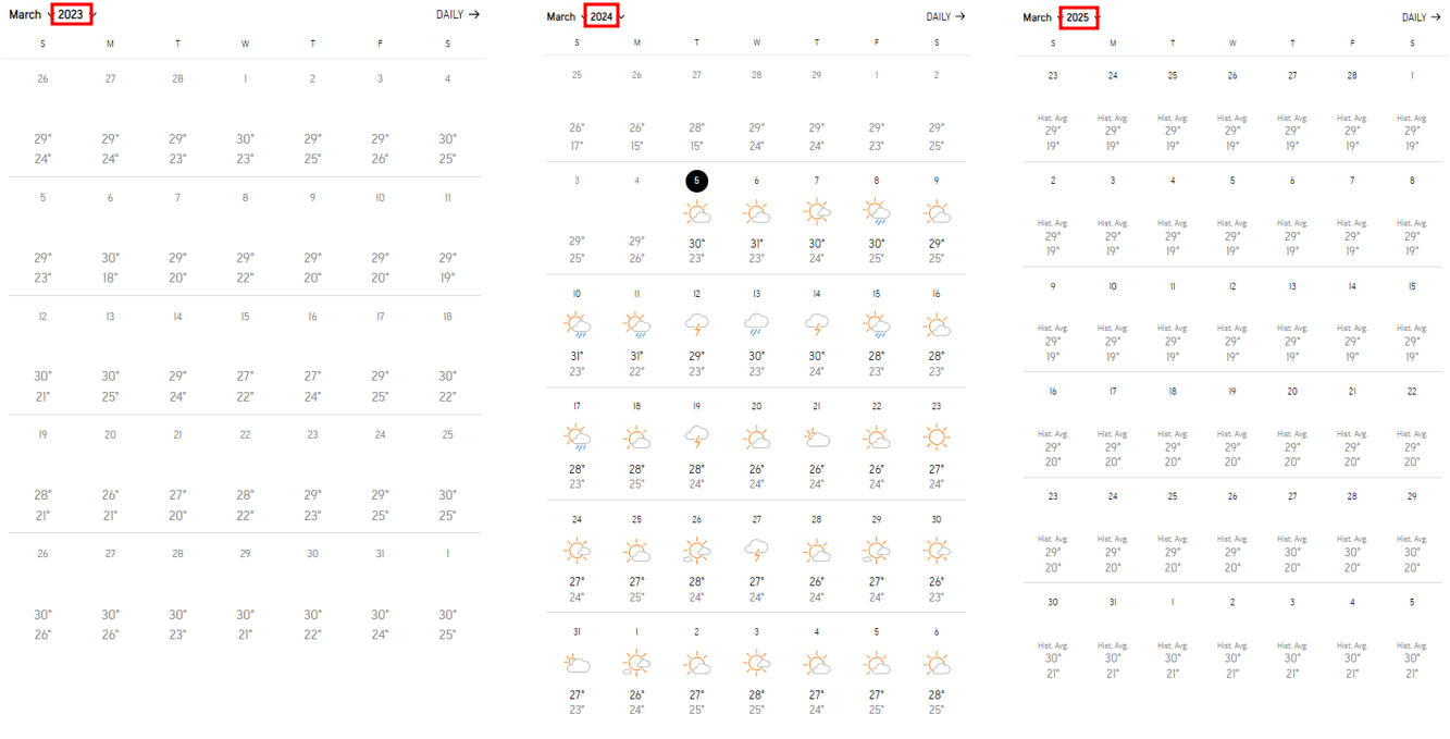 2023년부터 2025년까지의 날씨를 확인해보면 가끔 비가 내리는 지역이 있겠으나 대부분 화창합니다.