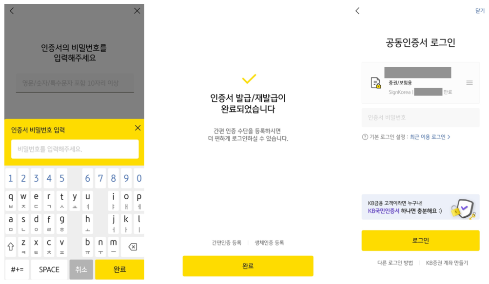 오늘은 이미 KB증권 회원으로 등록된 사람이 인증서를 발급/재발급 하는 방법에 대해 알아보았습니다.