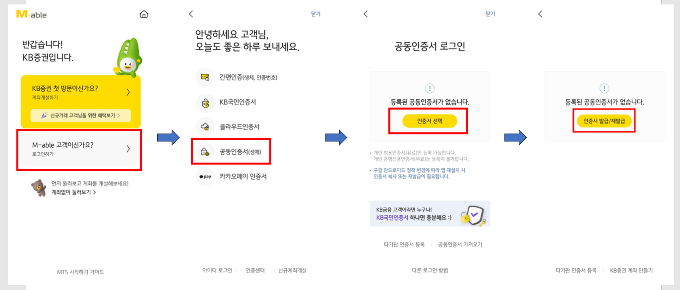 오늘은 KB증권 모바일어플 KB M-able에서 공인인증서를 다시 발급하는 방법에 대해 알아보겠습니다.